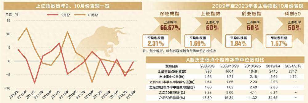 2009年、2010年、2014年出现了“金九银十”行情。以2014年为例,当年9月份上证指数涨6.62%,10月份涨2.38%。彼时A股正处于底部反弹期,自当年10月至次年6月,上证指数大涨超80%,这与当下的A股市场行情有一定相似之处。