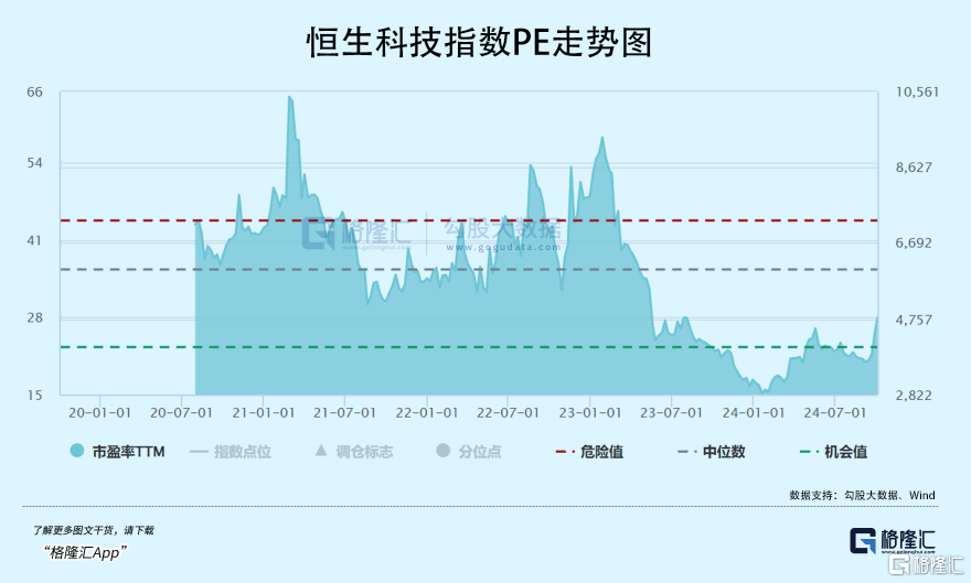即使港股经历了最近几个交易日的暴涨,估值并没有出现泡沫。据Wind显示,恒生指数最新PE为10.73倍,略高于过去10年估值中位数的10.73倍,不及危险值的11.97倍。恒生科技指数最新PE为28倍,不及过去5年中位数的36倍以及危险值的44倍。