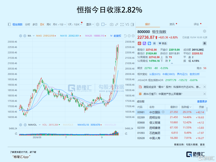 截至港股收市,恒指、国指、恒科指分别大涨2.82%、3.06%和4.99%,均完全超越前日大涨收市价。