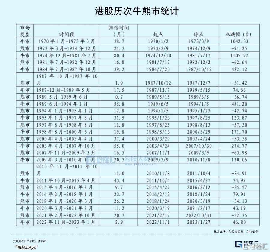1970年代以来,港股呈现明显的牛熊交替周期走势,一共经历了13次牛市,平均涨幅为174%。熊市则经历了12次,平均跌幅超过50%。