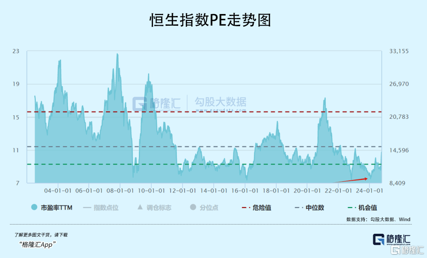 当然,港股弹性比A股很好,另外一大因素是估值水平比A股还要低得多。据Wind显示,在本轮大涨之前,恒生指数PE一度去到了8倍以下,是20年来历史低位水平,与2008年底、2016年1月、2022年10月大致持平。
