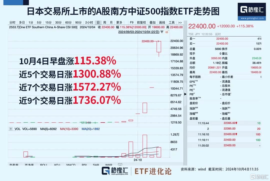 在日本交易所上市的A股南方中证500指数ETF,今日上午涨超115%,近5个交易日涨1300.88%,近7个交易日涨1572.27%,近9个交易日涨1736.07%。