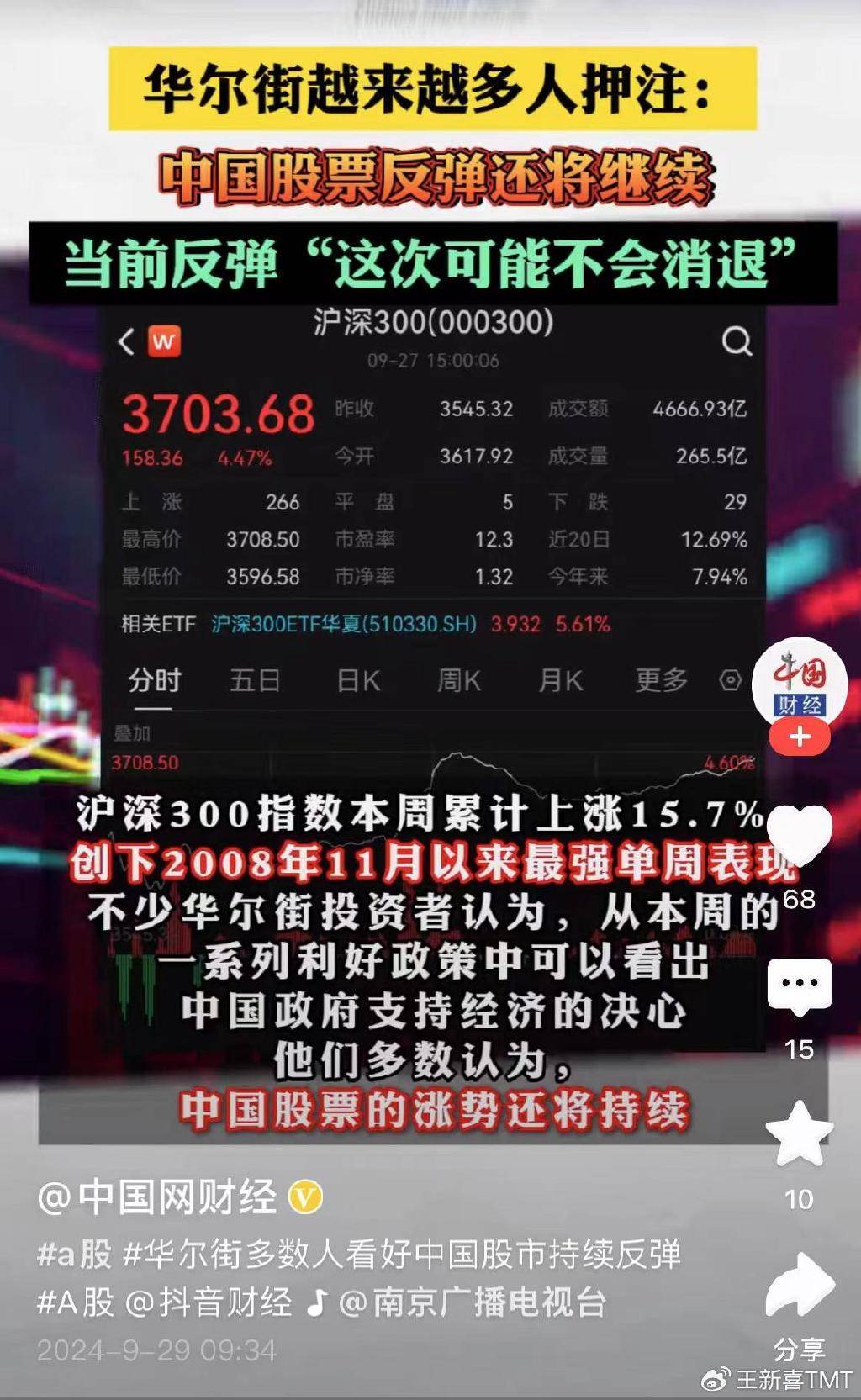 华尔街越来越多人押注,中国股票反弹还将持续,不少华尔街投资者认为,从本周的一系列利好政策中可以看出中国政府支持经济的决心。