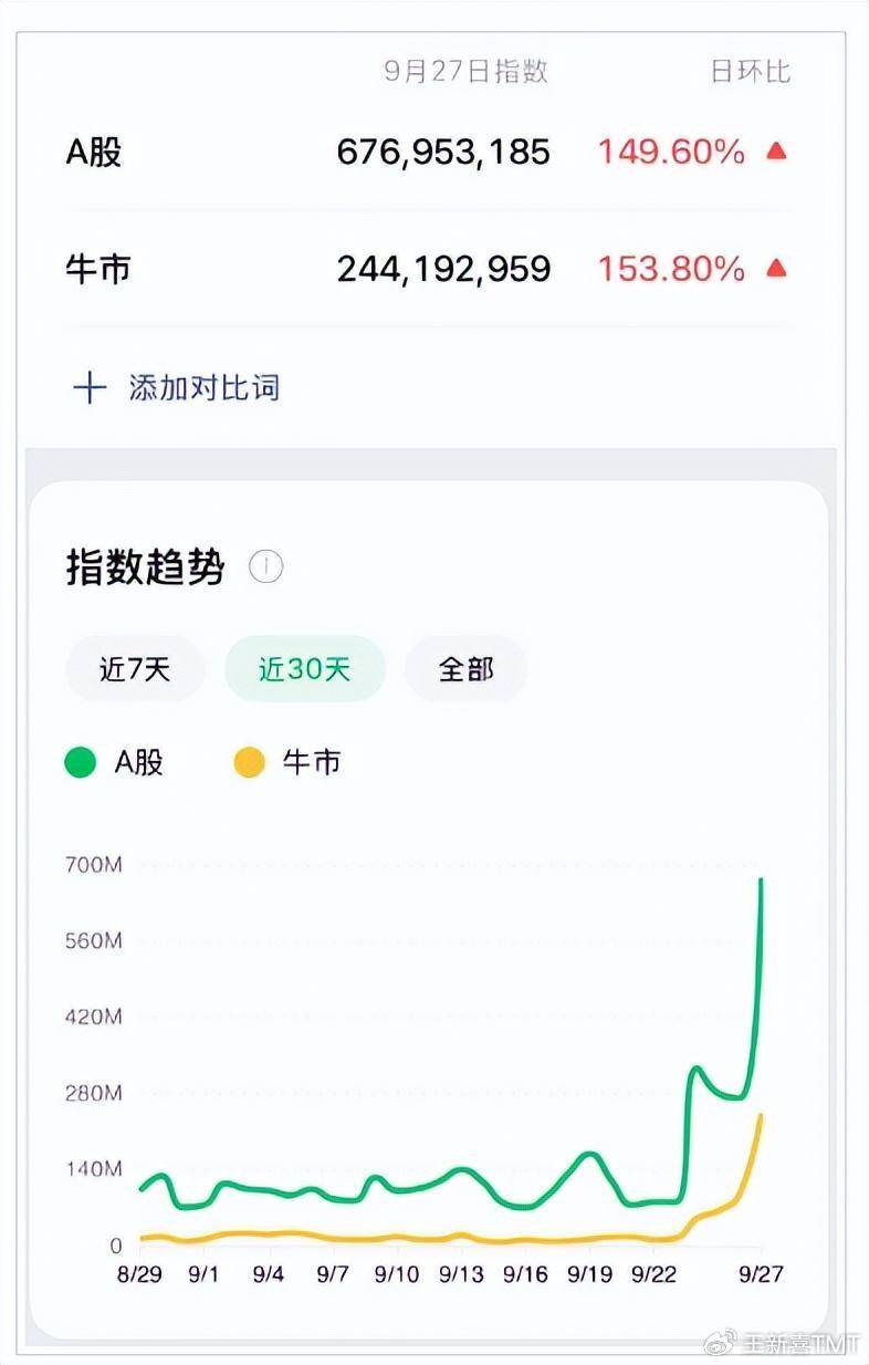 在一系列重磅政策的刺激下9月23日至9月27日,股市出现了近年来罕见的大涨行情,相关股票指数涨幅刷新多项历史纪录,特别是9月27日,创业板指涨10%创历史单日最大涨幅,成交金额近4400亿元也创出历史天量。A股市值一周涨近10万亿元。股民人均日赚4.7万元,有人利息都不要了,要拿存款入股市。