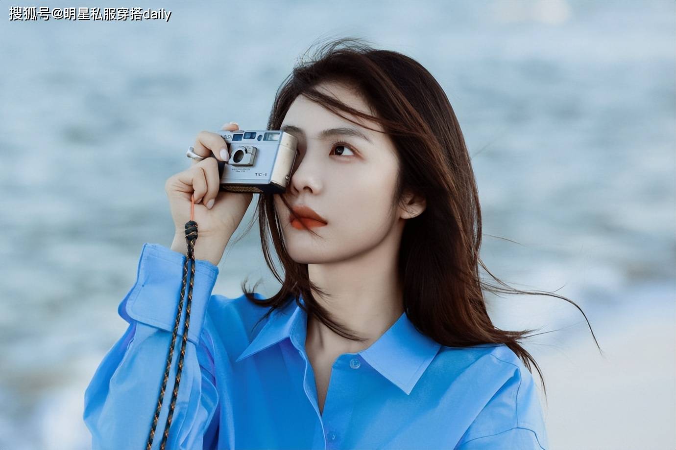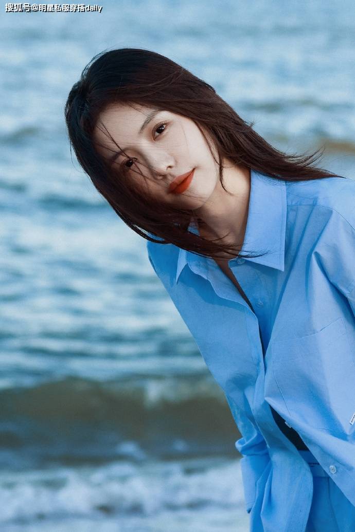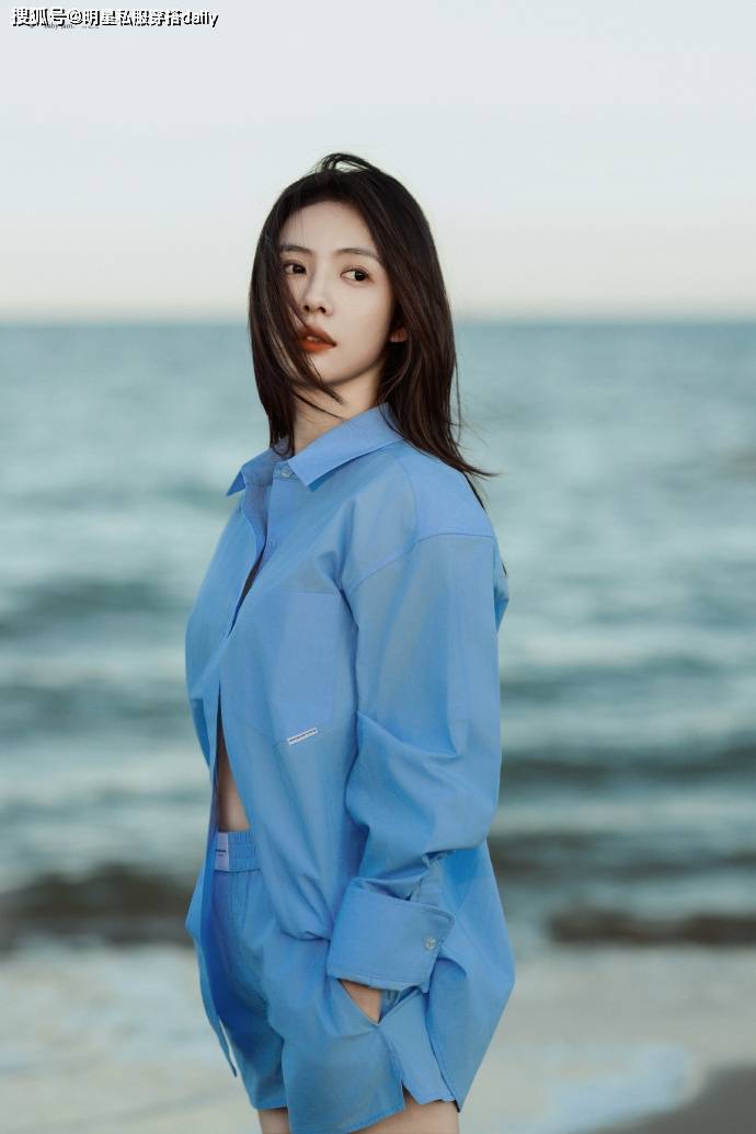 在这组大片中,蔡文静身着一袭蓝色长袖衬衫,搭配同色系的蓝色短裤,整体色调和谐统一,仿佛将海洋的深邃与宁静穿在了身上。衬衫的长袖设计不仅增添了几分优雅与知性的气质,还巧妙地与短裤形成了层次感,使整体穿搭更加富有变化和趣味。