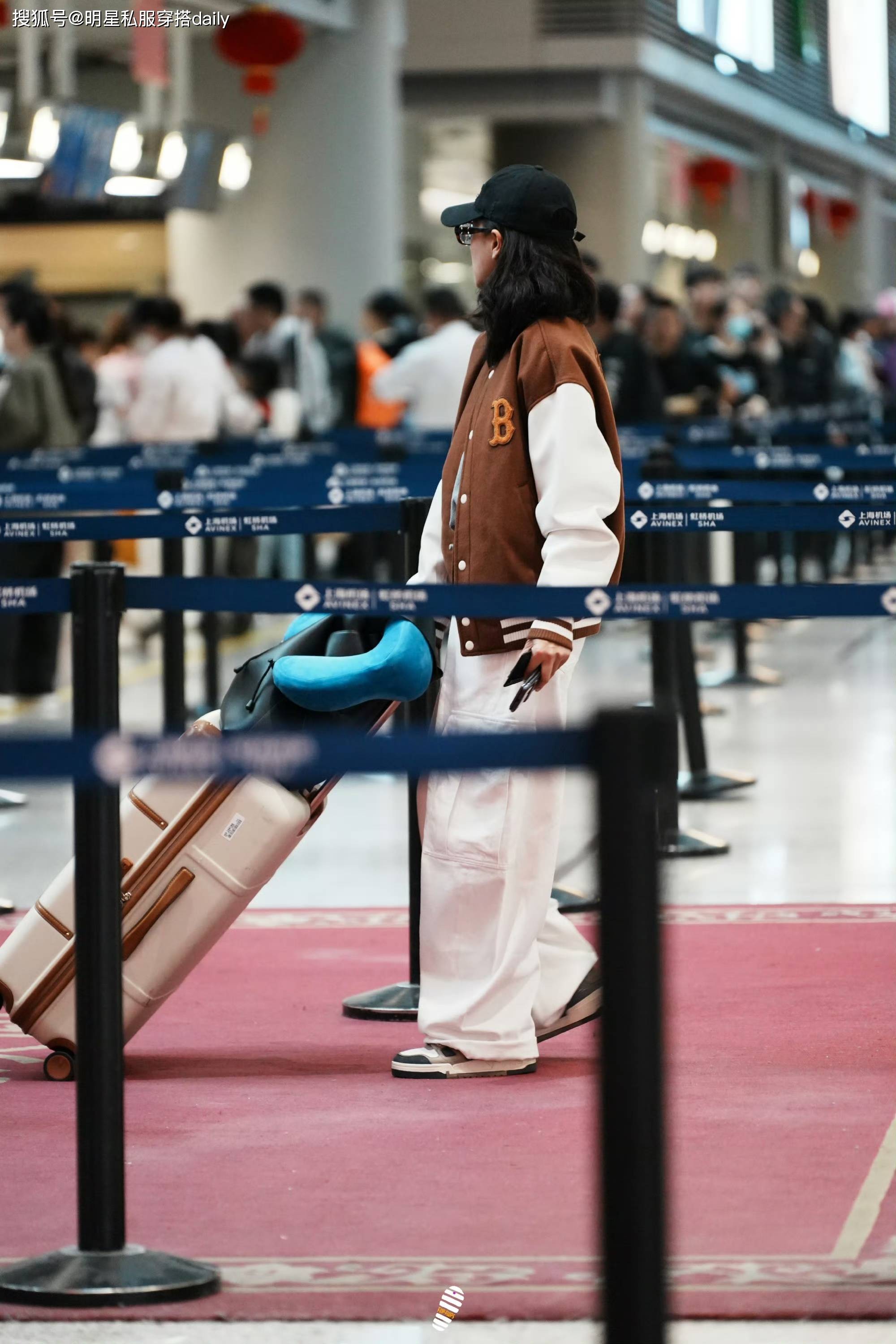 此外,万茜还外搭了一件棕色学院风棒球外套,不仅保暖实用,还为整个造型增添了一丝复古的学院风情。这种风格的穿搭,既符合万茜的年龄层,也展现了她对于时尚的独特理解。