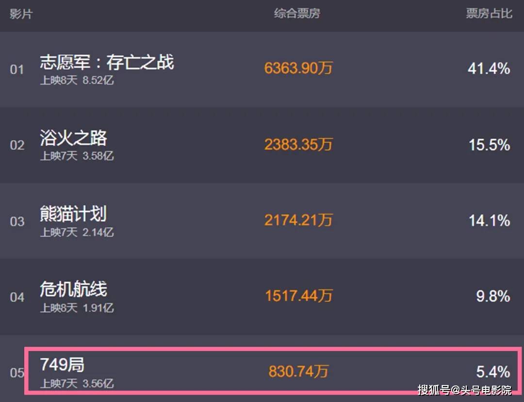 后面按票房高低,依次是《浴火之路》《749局》《熊猫计划》《危机航线》,但看看最新的10月7日的单日票房,《749局》以800多万票房垫底,和前一名的《危机航线》相比,只有一半左右。