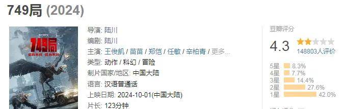 但现在《749局》的豆瓣评分还在继续下降,目前已经从5分降低至4.3分,成为今年国庆档评分最低的电影。