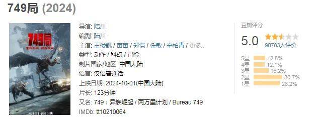 《749局》豆瓣开分仅5分,是国庆档唯一一部开分不及格的真人电影,低于《志愿军:存亡之战》7.5开分,而其他几部《浴火之路》《浴火之路》《危机航线》的开分也都在6分及格线以上。