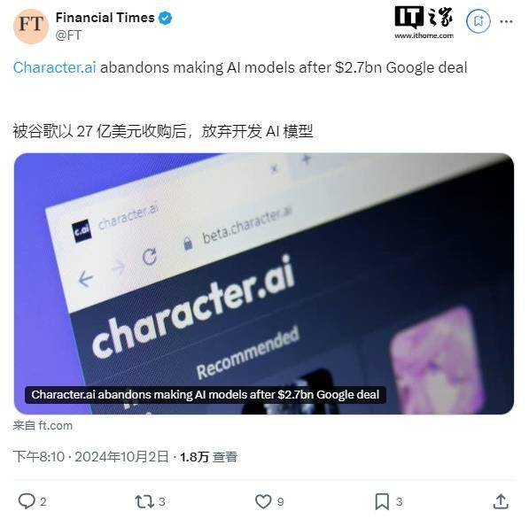 今年 8 月,谷歌以 27 亿美元(IT之家备注:当前约 189.67 亿元人民币)将两位创始人与 20% 的员工挖走。