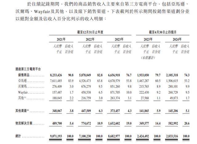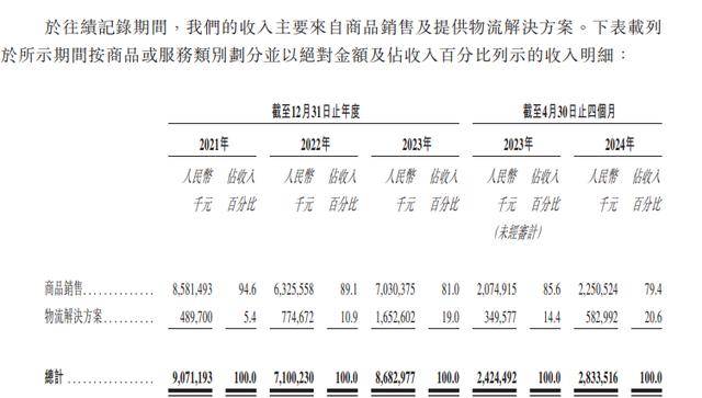 据招股书显示,2021年、2022年、2023年,截至到2024年4月30日物流贡献的收入分别为4.9亿元、7.75亿元、16.53亿元和5.83亿元。在总营收中的占比分别为5.4%、10.9%、19%和20.6%。