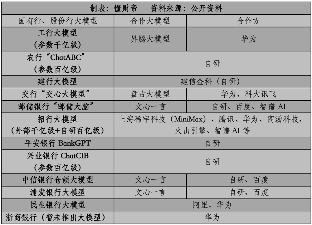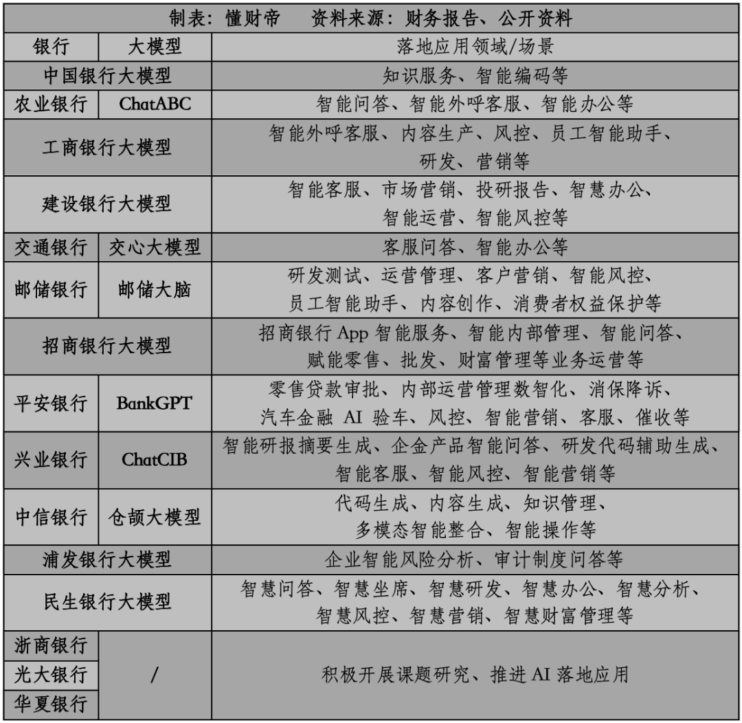 AI浪潮愈加汹涌。截至目前,中农工建交邮储6家国有大行都已经发布了自己的大模型,股份行中,招行、平安、兴业、中信、浦发、民生6家银行也已推出自己的大模型。