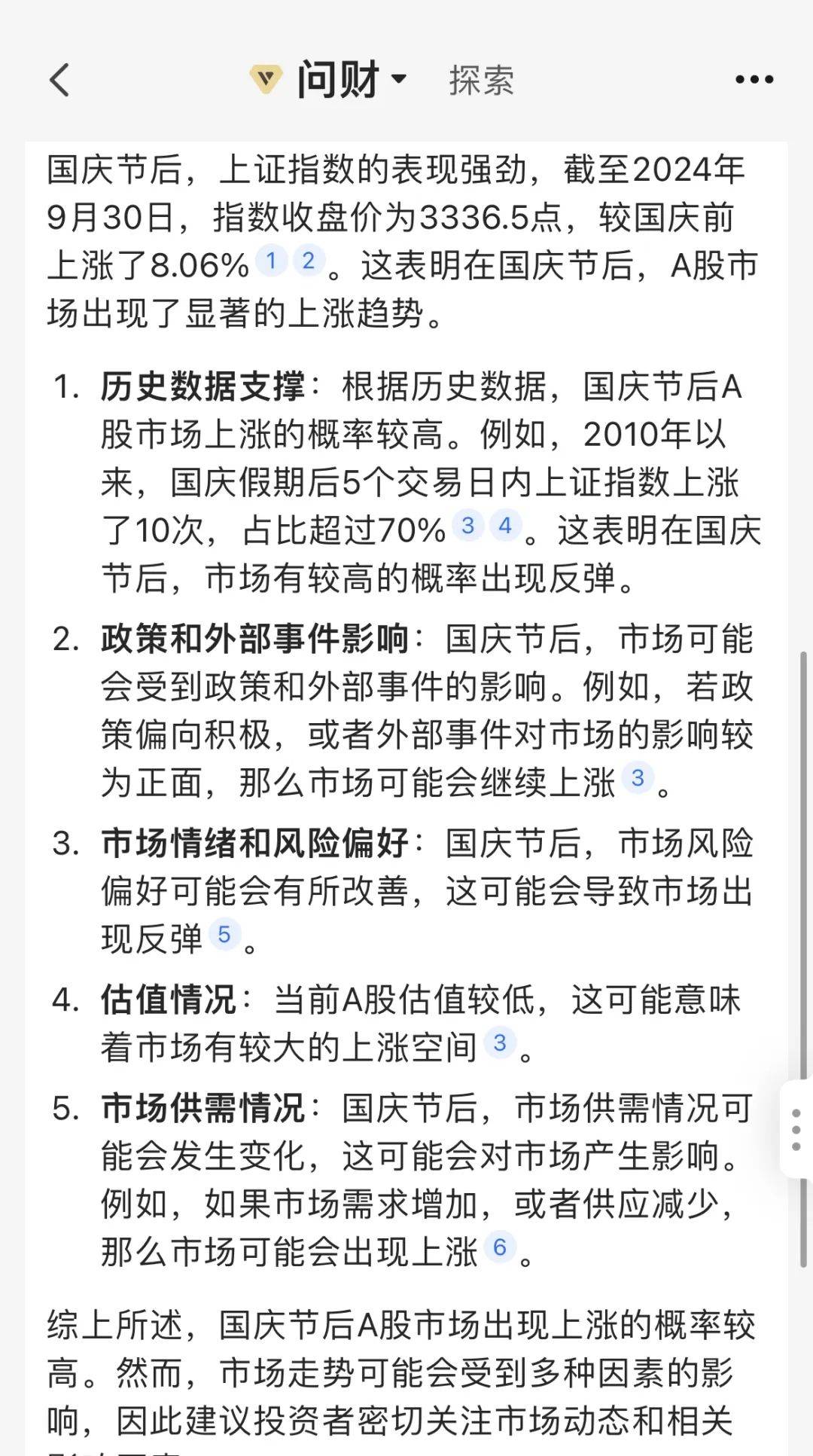 但同花顺AI的回答就比较混乱,开头就搞错了时间——“2024年9月30日反而在国庆之后”,后续的影响因素分析也很笼统。