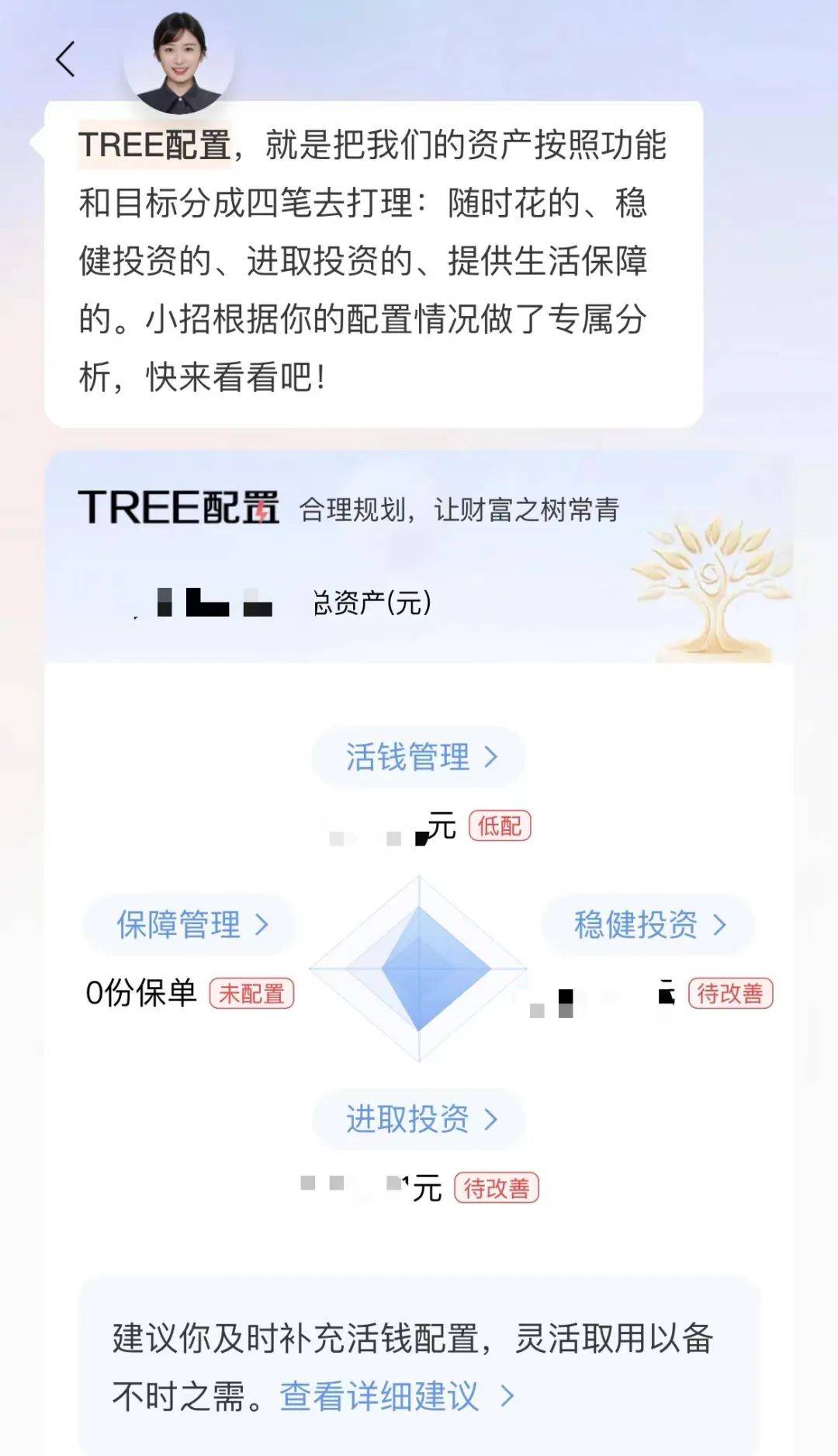 此外,“小招”还能针对笔者的资产给出了配置优化建议,如下图,“小招”就建议:及时补充活钱配置,灵活取用以备不时之需。