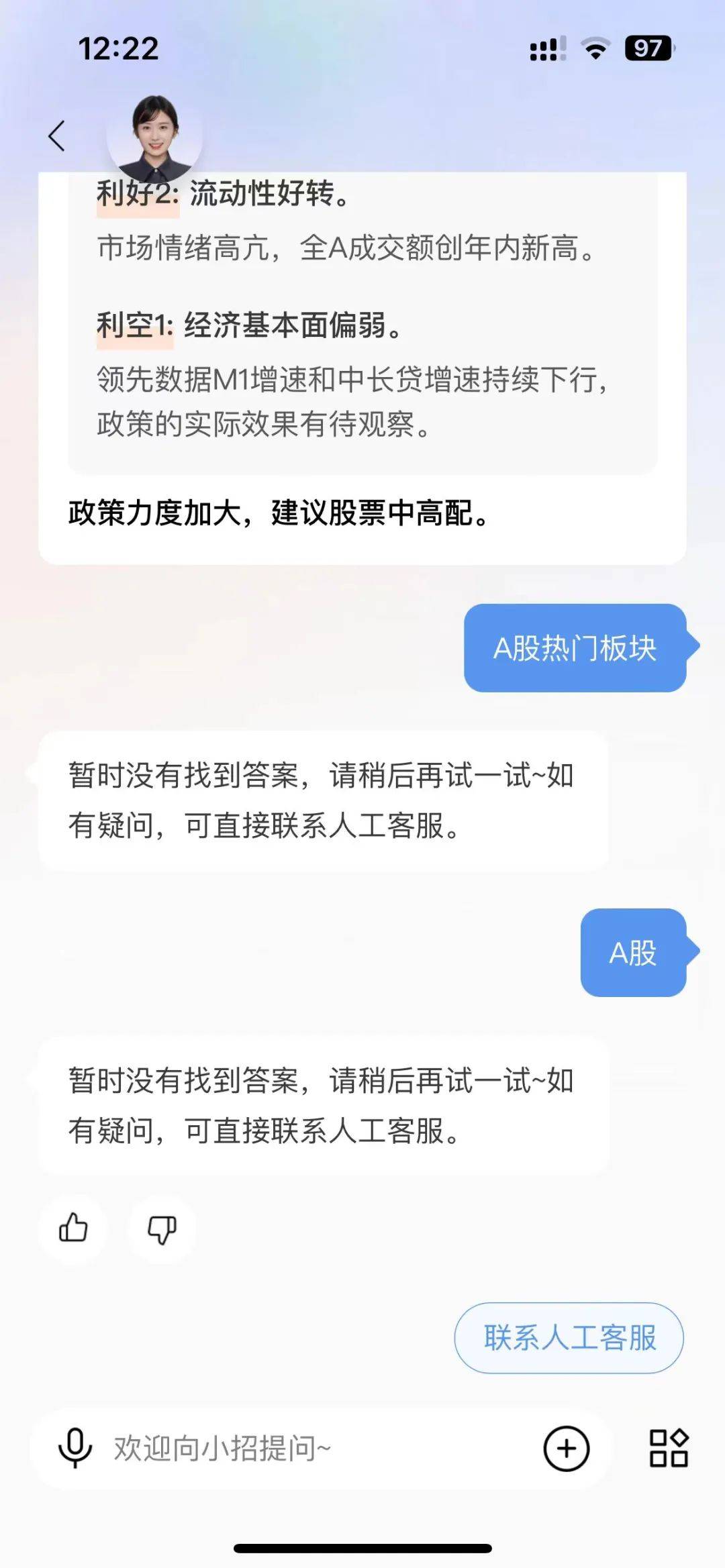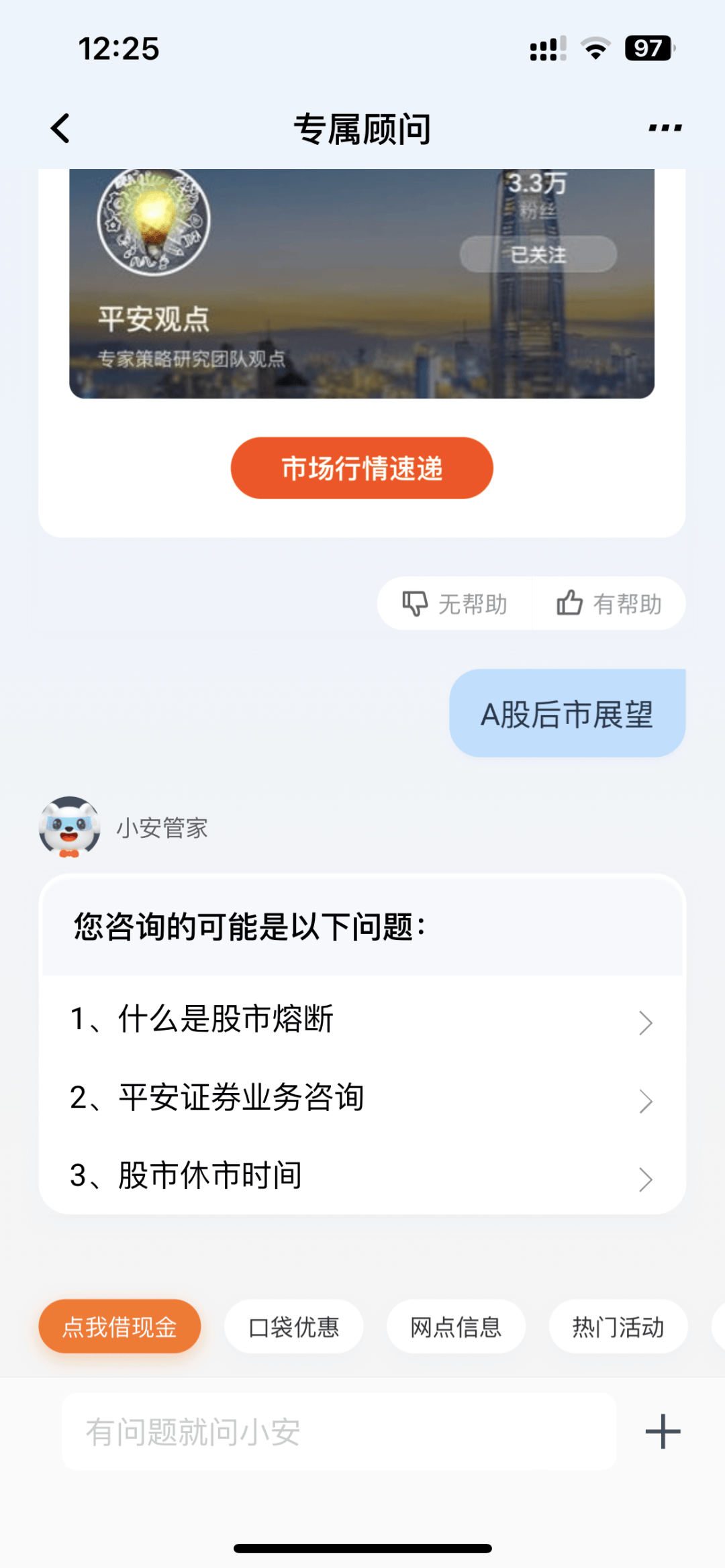 当笔者换了个问题,提问“A股”和“A股热门板块”,“小招”就无法回答了。在平安口袋银行APP中,笔者提问“A股后市展望”,“小安管家”也无法了解到我的实际需求,给出的问题推荐也都不匹配。