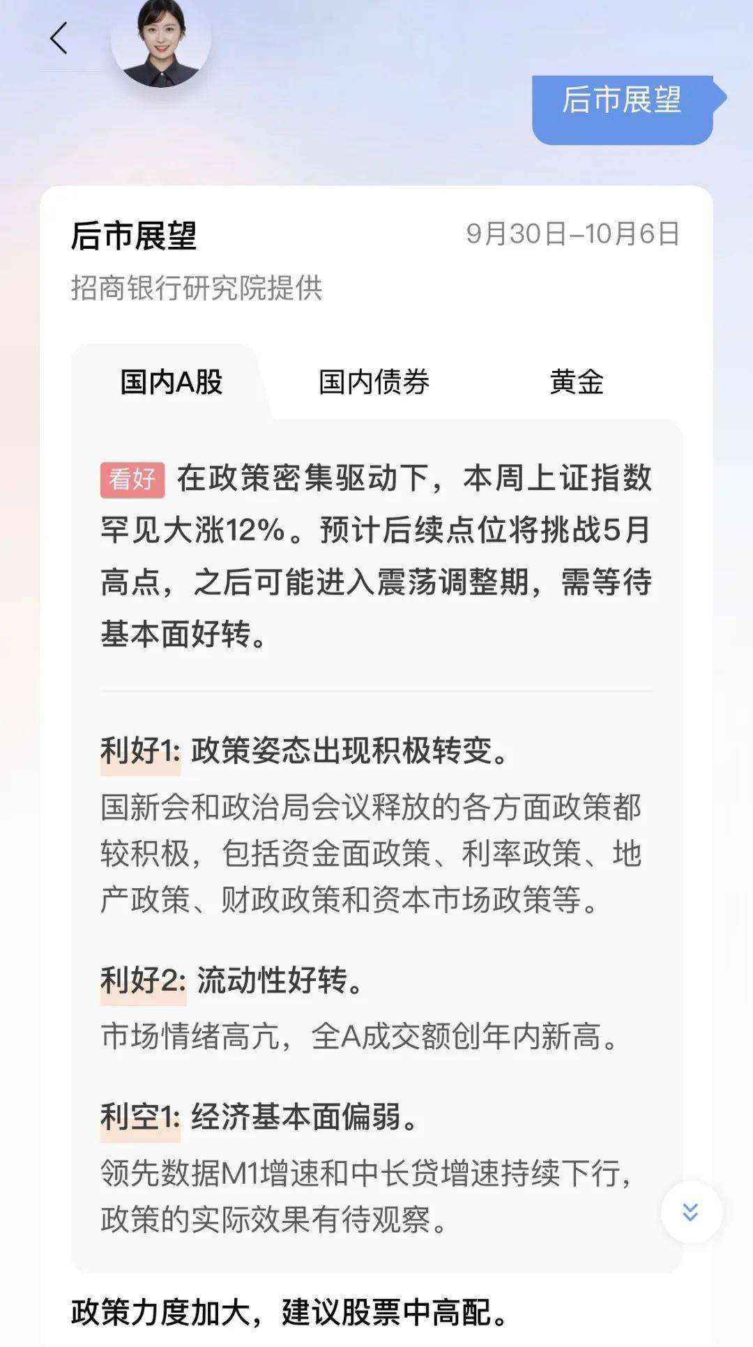 对比之下,招行AI给出的观点同时覆盖了股票、债券、黄金三个投资品种,相对完善,利好、利空的原因分析也比较切合实际,确实具备一定的参考价值。
