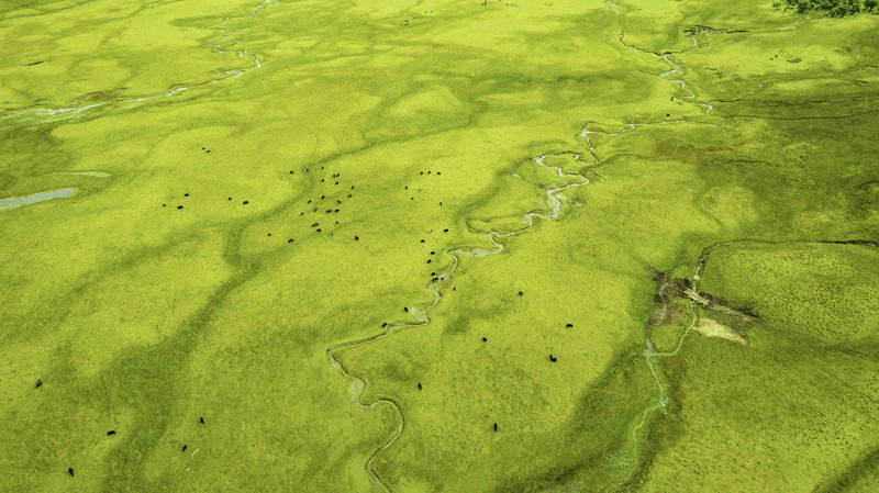在湖泊旁,徒步的小径通向开阔的草甸,漫步其中,眼前是绚烂的秋林与宁静的牧场交织的画卷。远处的群山在阳光的映照下时而明亮,时而朦胧,与近处的草甸形成了一种静谧而悠远的美感。在草甸上,还会见到成群的牛羊,它们悠闲地在这里吃草,仿佛这片天地间的一部分,宁静而自在。