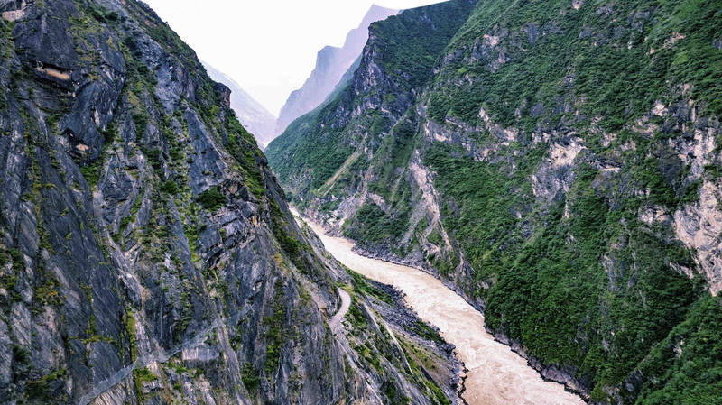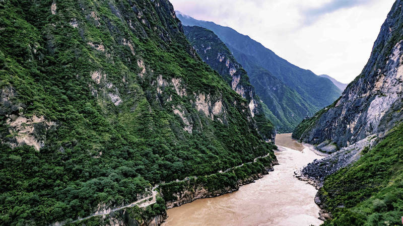 虎跳峡全长约17公里,是金沙江沿岸的一个深切峡谷,它分为上虎跳、中虎跳和下虎跳三段。整个峡谷两岸高山耸立,最高峰哈巴雪山和玉龙雪山直插云霄,山体垂直落差超过3000米,气势磅礴,令人叹为观止。其中的江水湍急,在高山的夹持下,虎跳峡以其险峻、壮丽和野性而闻名。沿江而行的道路仿佛切割在山体之上,每一转角都是一个新的视觉冲击。