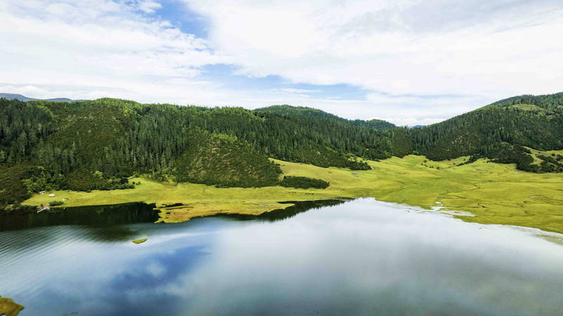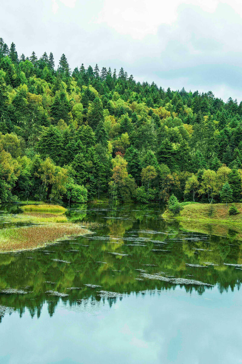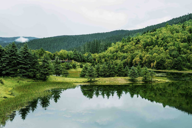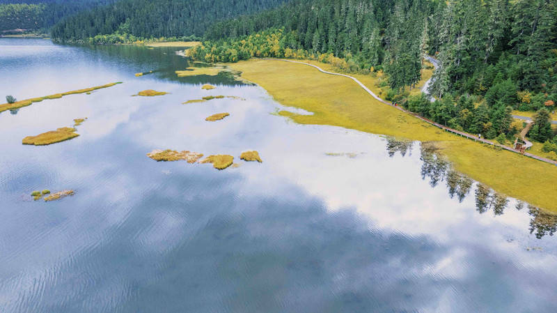 在普达措国家公园,最值得一去的打卡点莫过于碧塔海和属都湖。这两片湖泊的水清澈见底,倒映着岸边五彩斑斓的树林与湛蓝的天空。秋日的阳光洒在湖面上,湖水如镜,仿佛时间在这里被悄然凝固。