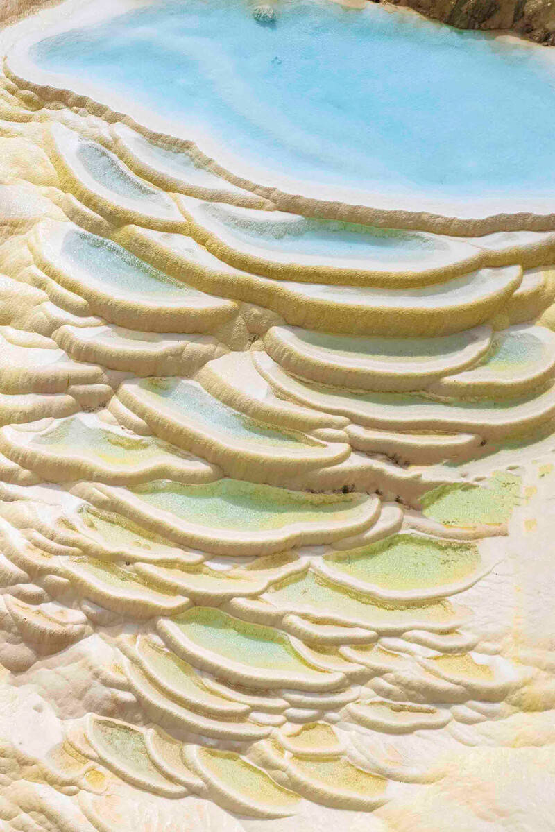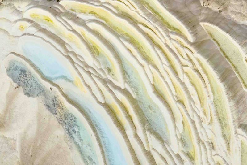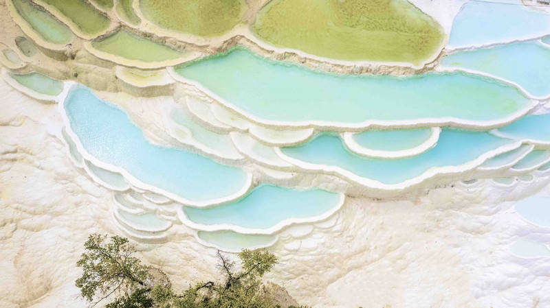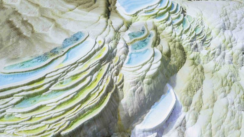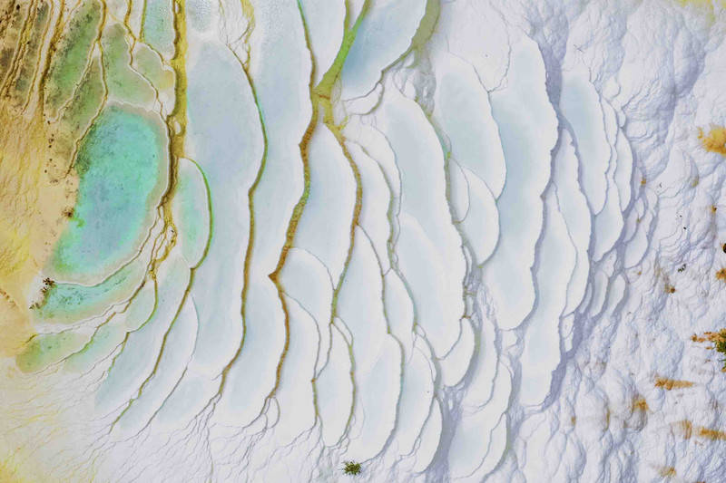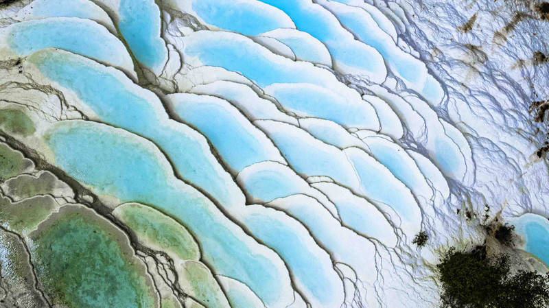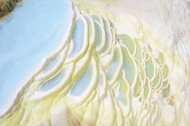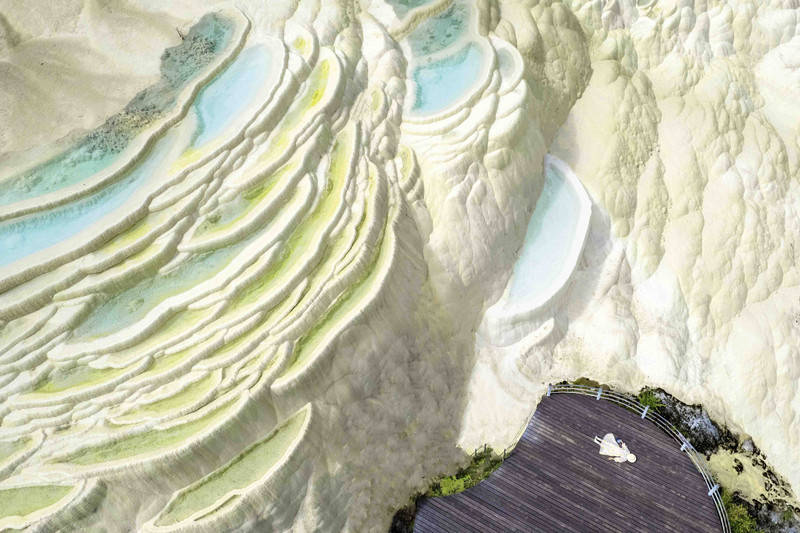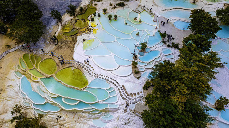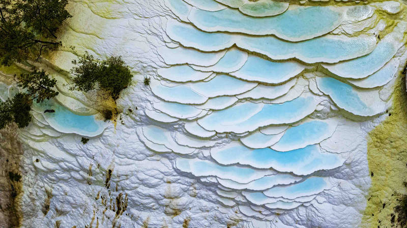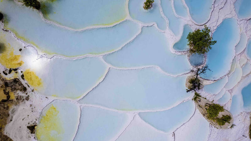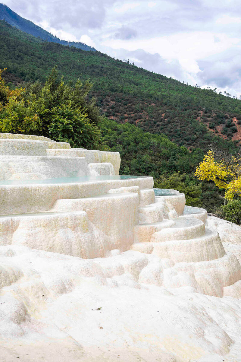 白水台的形成过程是一个缓慢而神秘的自然奇观。碳酸氢钙溶解在山间泉水中,随着泉水缓缓流下,逐渐沉淀,经过时间的洗礼,碳酸盐逐渐在地表堆积,形成层层叠叠的天然梯田。从高空俯瞰,白水台就像是一位仙人亲手雕刻的艺术品,那一片片白色的台阶与周围的绿树融为一体,色彩纯净得让人无法忘怀。