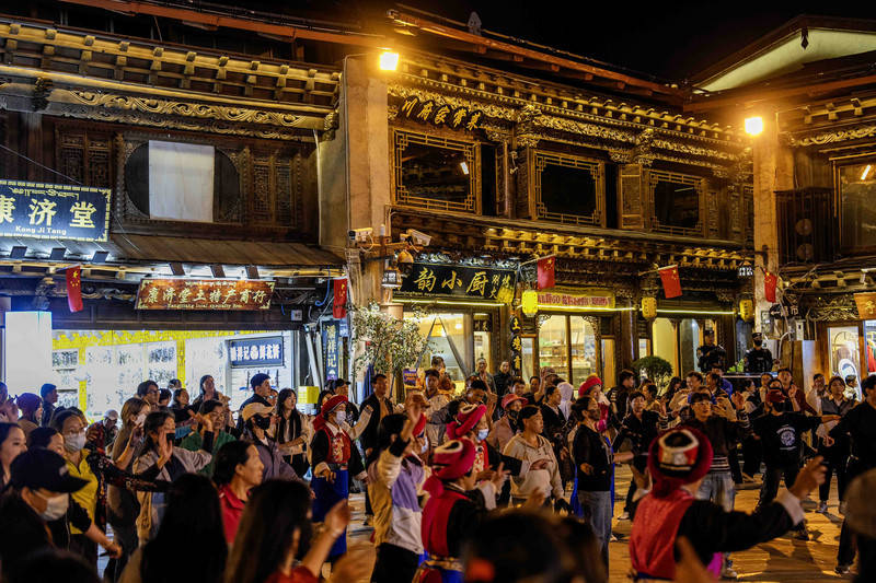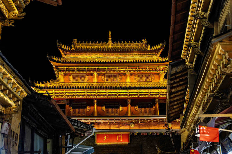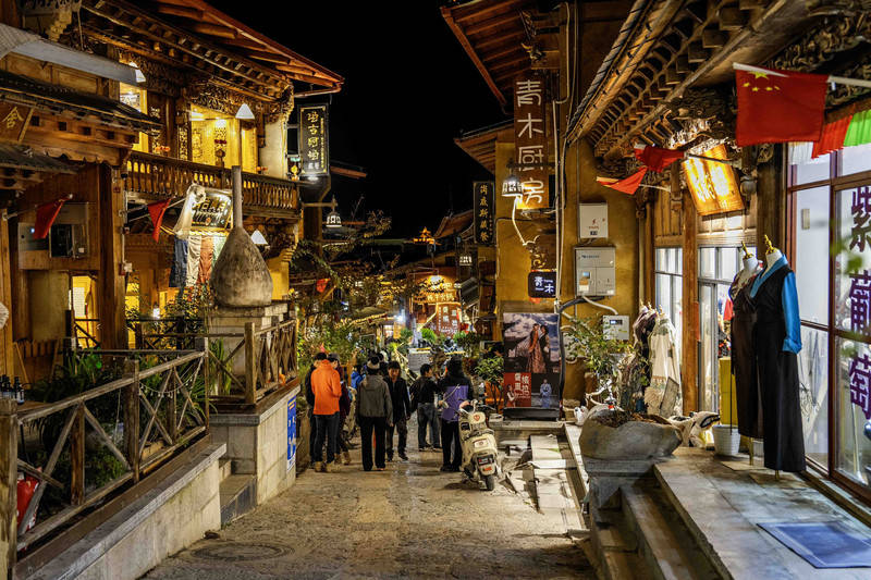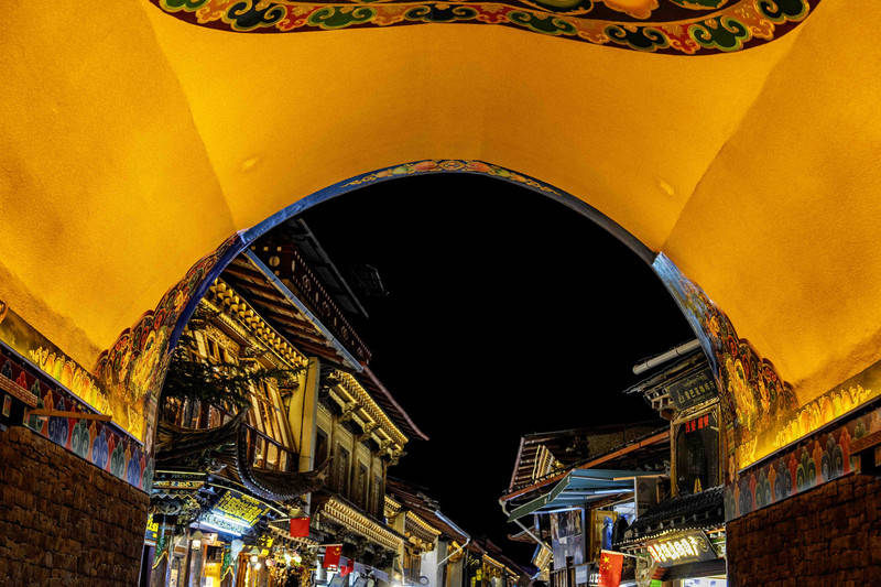 在夜色的笼罩下,独克宗古城的魅力愈发迷人。古城的街道被温柔的月光洒满,石板路闪烁着淡淡的银光,仿佛是时光的流转让人不由得想要沉浸其中。两旁的民居在夜幕下显得更加古朴而温馨,窗户透出的灯光犹如星星点点,散发着温暖的气息。