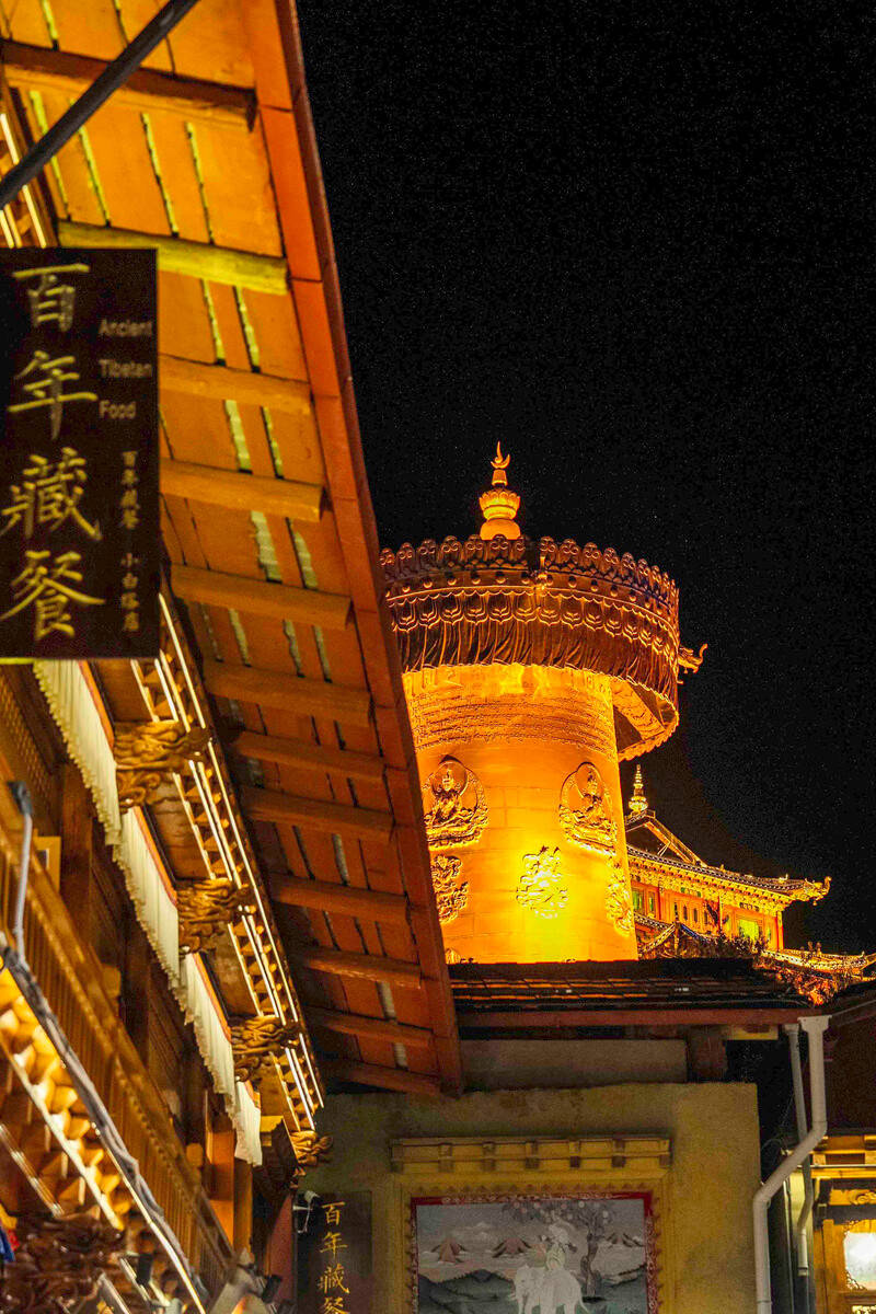 我们此行选择在晚上去参观独克宗古城,当皎洁的月亮缓缓升起,被誉为“月光城”的独克宗古城被轻轻点亮,像是一颗璀璨的明珠镶嵌在香格里拉的夜空中。在这凉爽的夜风中,在古城的石板路上穿梭,古朴的街道、精致的民居、秀美的龟山,以及那金碧辉煌的大转经筒,构成了一幅动人的藏式美景。