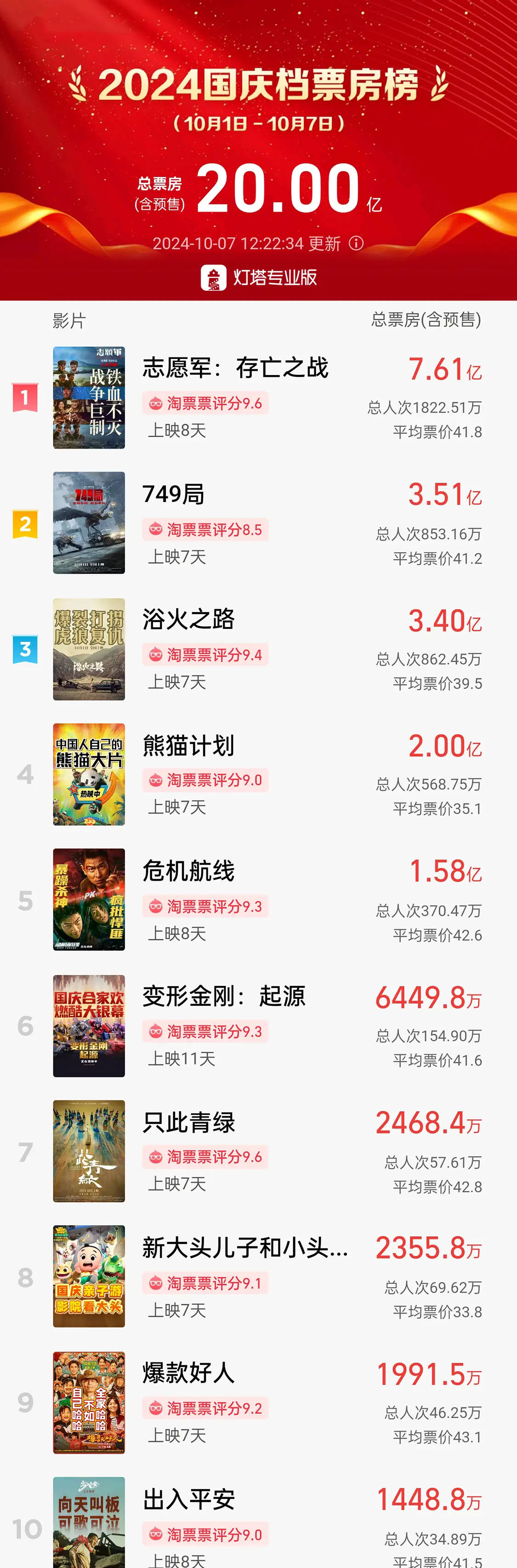 搜狐娱乐讯 据灯塔专业版,截至10月7日12时22分,2024年国庆档(10月1日—10月7日)档期总票房突破20亿元。《志愿军:存亡之战》《749局》《浴火之路》分列10月票房榜前三位。