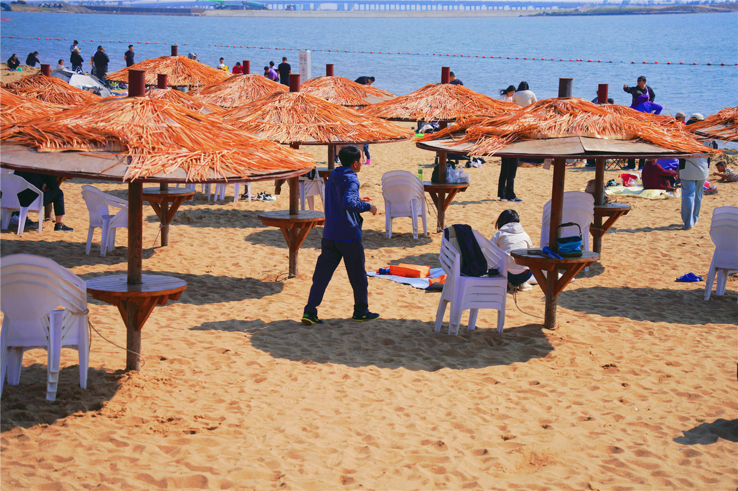 沙滩上还有很多小朋友可以玩的娱乐项目。这里可以自己扎帐篷,也有沙滩遮阳伞。孩子下水的话可以租服装穿着下水,现在天凉了,不适合赤脚下海,海边租防水的连体皮裤很棒。防水保暖。