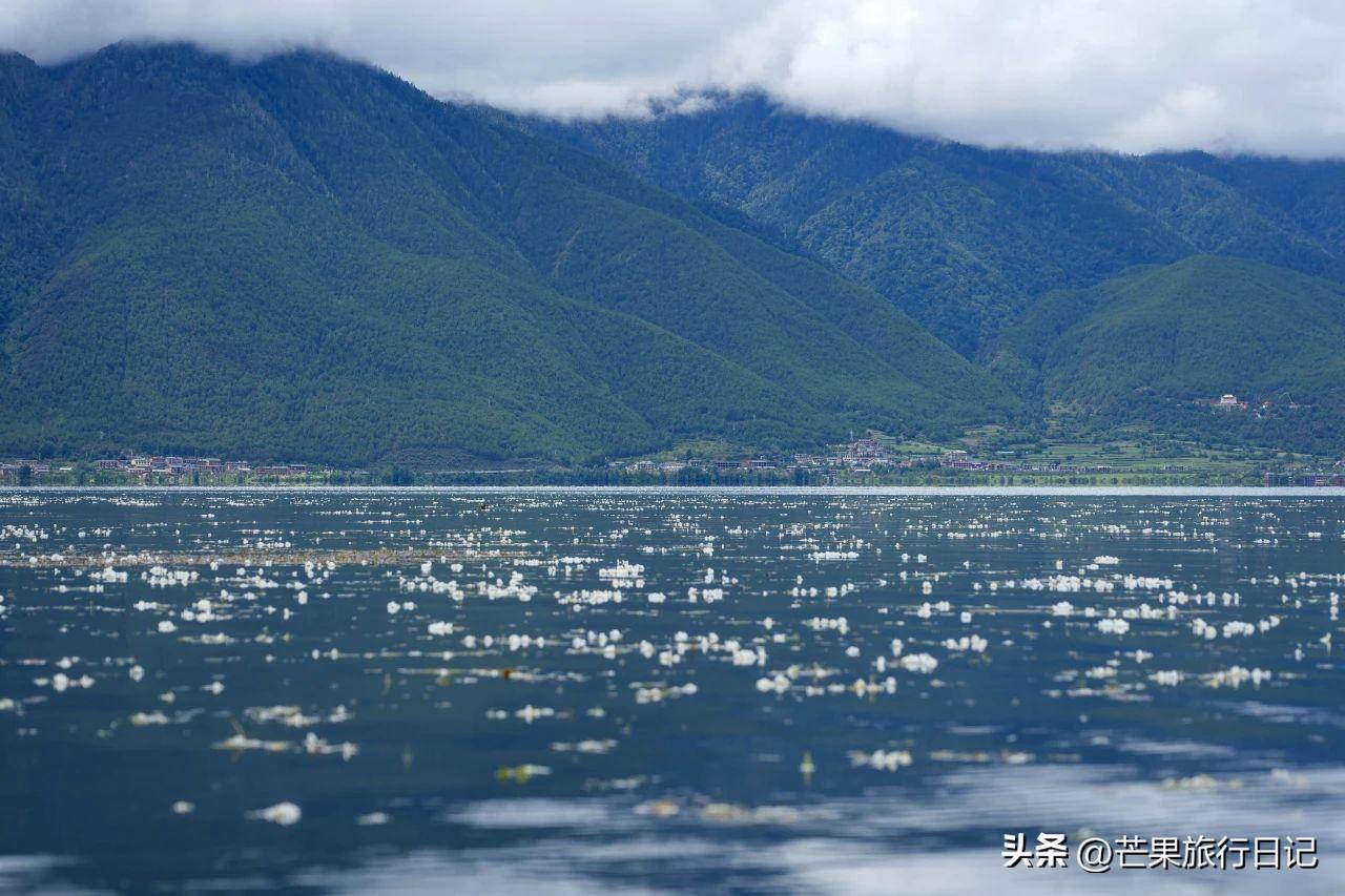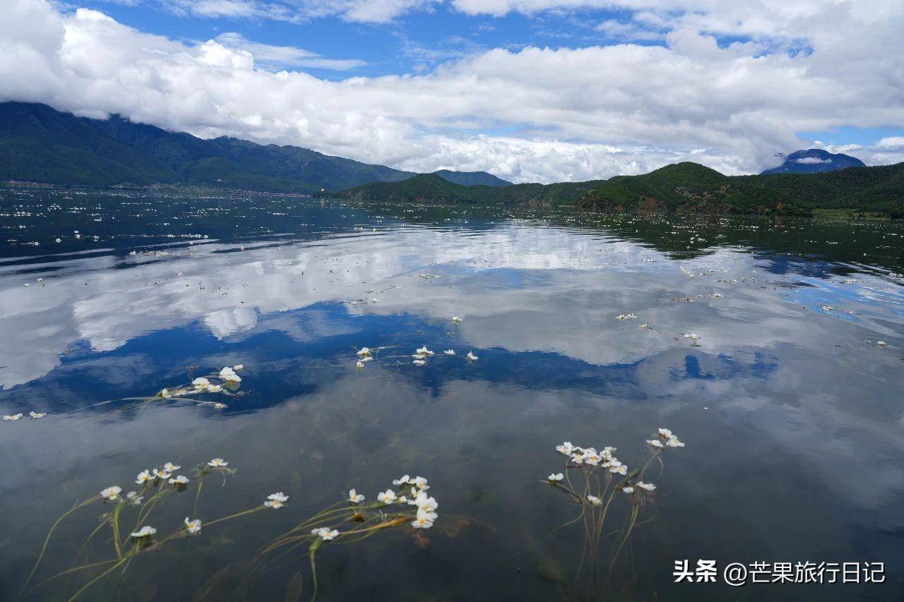 这里6-10月份生长着一种特别美的花朵,叶子长在水中,花瓣漂浮在水面上,坐在船上置身其中有种“满船星梦压星河”的错觉,这种花当地人叫海菜花,游客称其为“水性杨花”,可食用,到了泸沽湖可以到餐馆里尝尝。