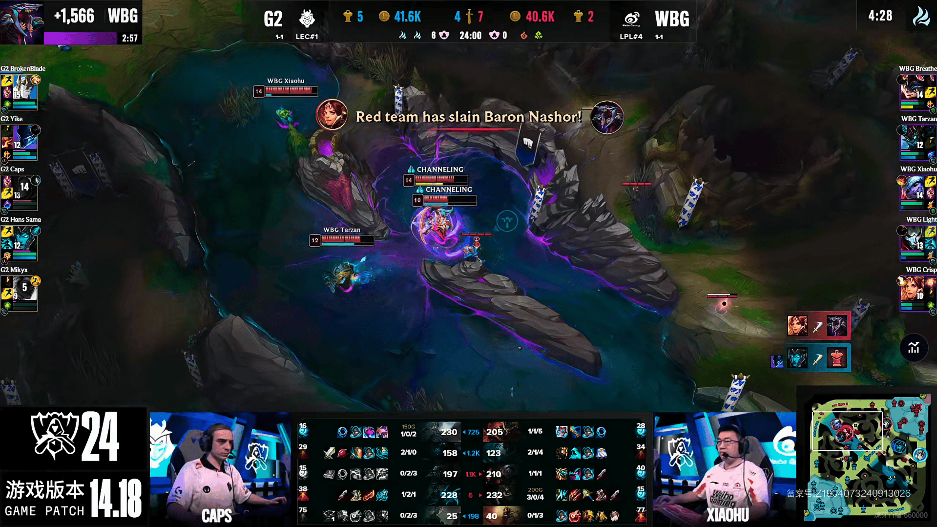 比赛26分钟两队在河道大龙处,再度爆发团战,但这波G2将WBG五人团灭,WBG在大龙处将G2加里奥给抓死,而G2支援不及只能去控下小龙。