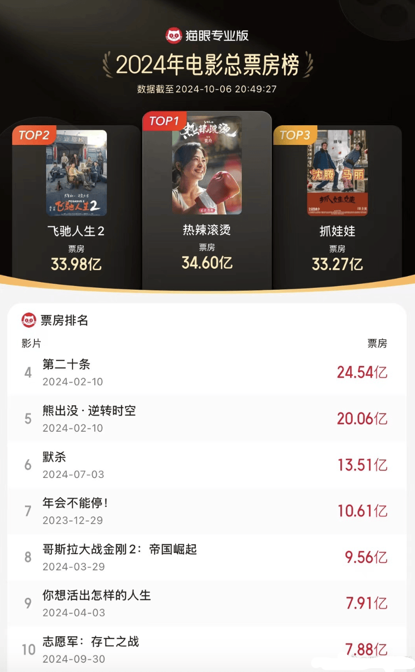 《志愿军2》进入2024票房榜前十!累计票房突破7.88亿