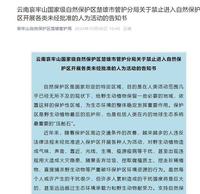 10月6日,哀牢山自然保护区楚雄管护局发布《云南哀牢山国家级自然保护区楚雄州辖区访客须知》及《关于禁止进入自然保护区开展各类未经批准的人为活动的告知书》,其中明确:未经批准进入自然保护区或者在自然保护区内不服从管理机构管理的,由自然保护区管理机构责令其改正,并可以根据不同情节处以100元以上5000元以下的罚款。