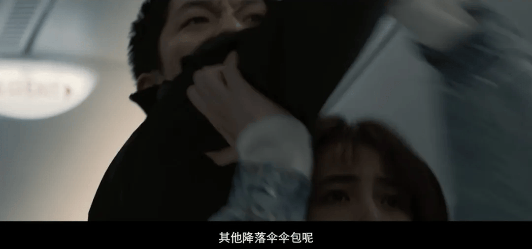 前面蒋梦婕饰演的乘务员,说自己刚刚获得空中跳伞资格证,没错,这时候就派上用场了,NPC触发技能:抱着小军跳伞。