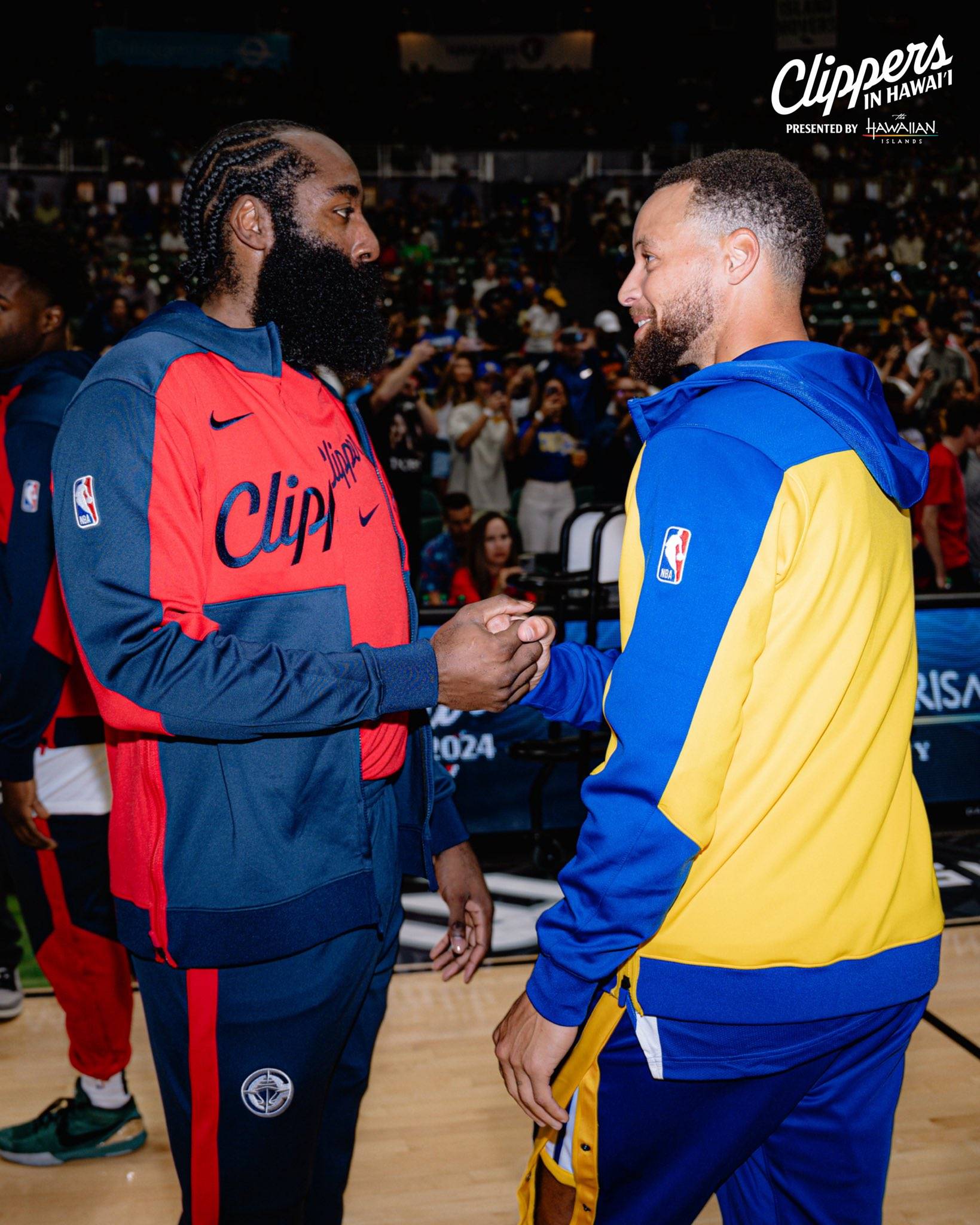 库里入场时,哈登加入球迷呐喊呼唤库里,如此一幕太有趣;哈登和库里还在赛前紧紧拥抱并且开怀热聊,09一届的两大球星都满脸笑容。