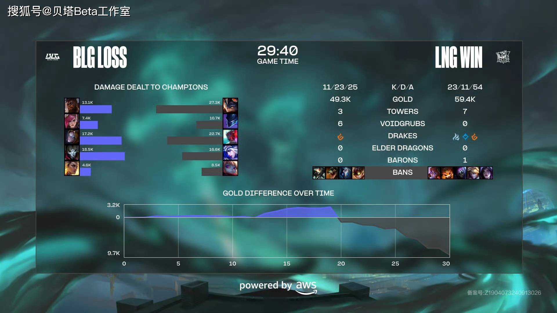 首先第一局是BLG和LNG的内战,BLG在前期优势的情况下,惨遭LNG翻盘,中后期LNG的团战发挥出色,Scout的永恩疯狂收割,而BLG则是knight发条隐身,团战溃败后,BLG苦吞S14世界赛首败。