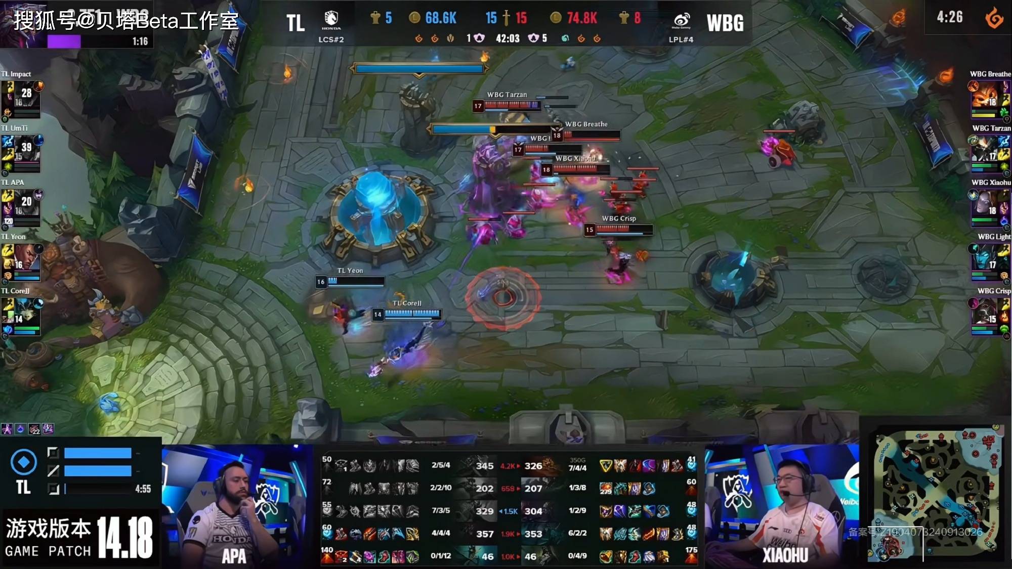 第三局WBG和TL的比赛,本以为这是一场稳稳的胜利,谁知道WBG整了大活,在前中期狂失误,给了TL很多机会,TL这边一度拿到了主动权,但是好在后面TL开始迷失,中后期不知道怎么把优势转为胜势。而WBG虽然也有很大的问题,但运营还是强于TL,最终在双方互相失误中,WBG有惊无险拿下首胜。