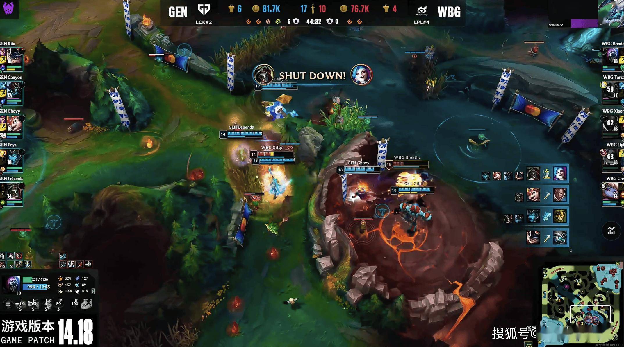 这基本上可以完美的全是S14瑞士轮首日WBG和GEN这一场比赛,GEN虽然在联赛里打得非常强势,但一来到世界赛的舞台,尤其是自己的第一场比赛,打得极其谨慎和小心,所以在阵容上也是选了这种非常依赖中后期的阵容,双方在前期并没有太多碰撞,小打小闹的零星团战也没有将双方的经济差拉开,GEN虽然在开局玩了一手换线,但对比之前T1打TES的那场换线,效果一般。