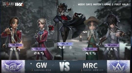 GW的求生者选择了“心理学家”、飞行家、勘探员、佣兵;MRC的监管者XC选择了歌剧演员。(BAN先知、祭司、古董商、野人)
