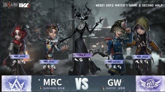 MRC的求生者选择了火灾调查员、佣兵、杂技演员、哭泣小丑(BAN歌剧演员);GW的监管者D选择了时空之影。(BAN先知、祭司、空军、“心理学家”)
