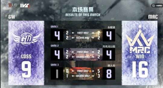 最终,MRC以1胜2平0负(16:9)的比分击败GW,获得本场比赛的胜利。