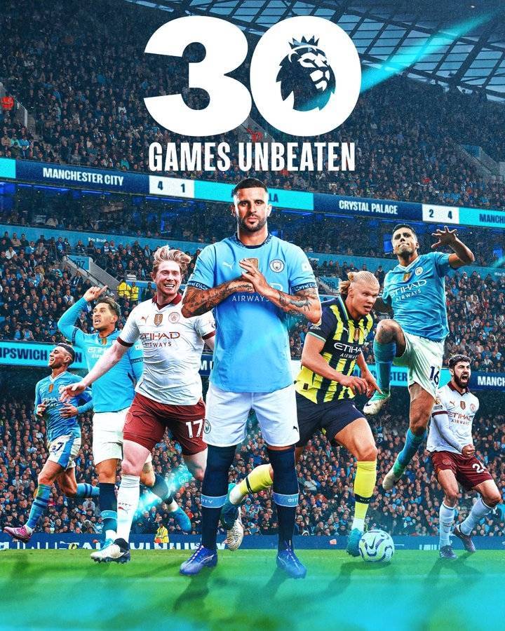 据统计,曼城已经在英超连续30场不败,此数据追平了队史最佳纪录。
