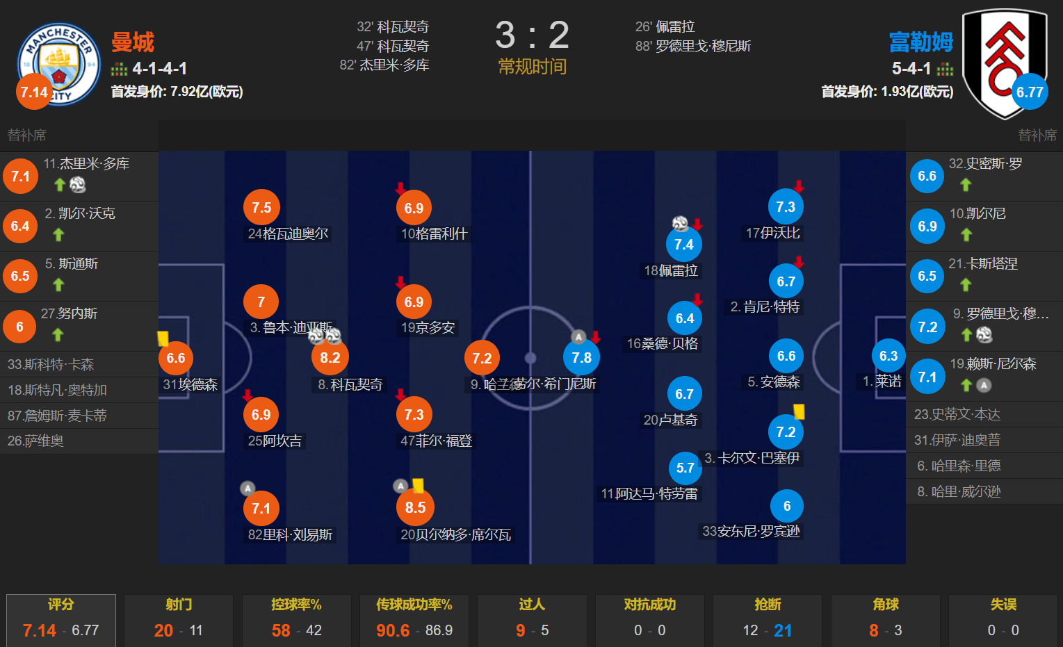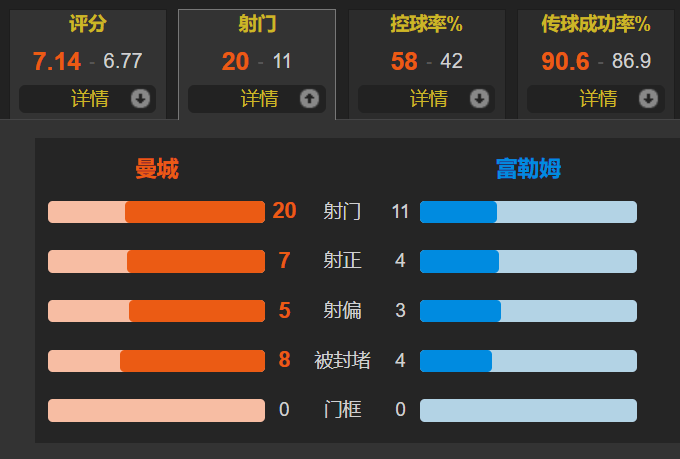全场比赛,曼城的控球率为58%,一共有20次射门,其中7次射正;富勒姆一共有11次射门,其中4次射正。