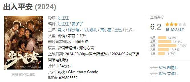 在豆瓣平台,《出入平安》的最新评分仅为6.2分,三星评价占比最高,约为32%,一星差评高达11.7%,仅好于52%的剧情片。