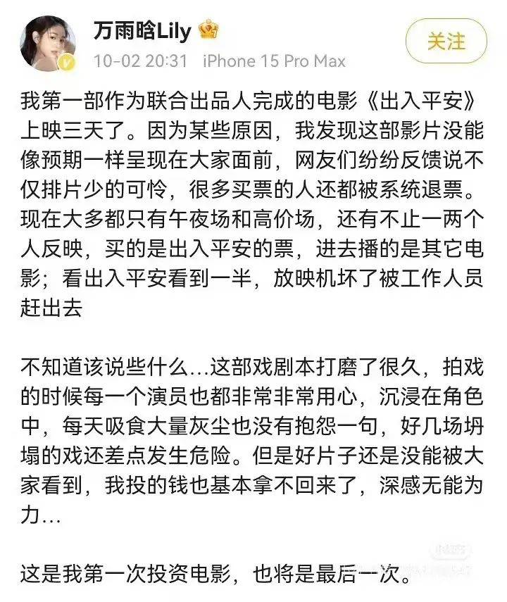 现如今倒推《出入平安》的撤档,一方面在于电影初期争取的排片就极其有限,开局就进入到了“地狱模式”;另一方面在于电影排片持续压缩,10月3日进一步压缩到了2.1%,尽管主创依然在坚持路演,但是严重“排片掉队”导致影片的宣发动作无法将目标受众拉进影院,看不到逆袭的可能。
