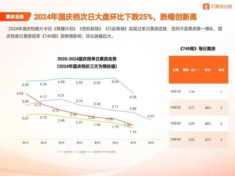 今年国庆档的大盘首日4.94亿,是近十年国庆档首日票房第四高。但次日大盘就下滑至3.73亿,10月4日已经跌至2.69亿,整体的高开低走又将国庆档的票房压力拉高。这一方面是因为供给侧内容质量的不稳定带来的口碑争议,劝退了一部分“路人观众”,另外一方面,档期影片“过度集中”带来部分影片的排片困境,某种程度上也造成了“核心观众”的入场困难。