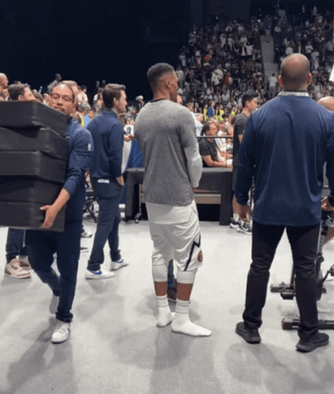 赛后,威少爷将自己的球鞋送给了场边的球迷,光着脚还不立场,继续跟球迷互动合影,这就叫优质偶像。
