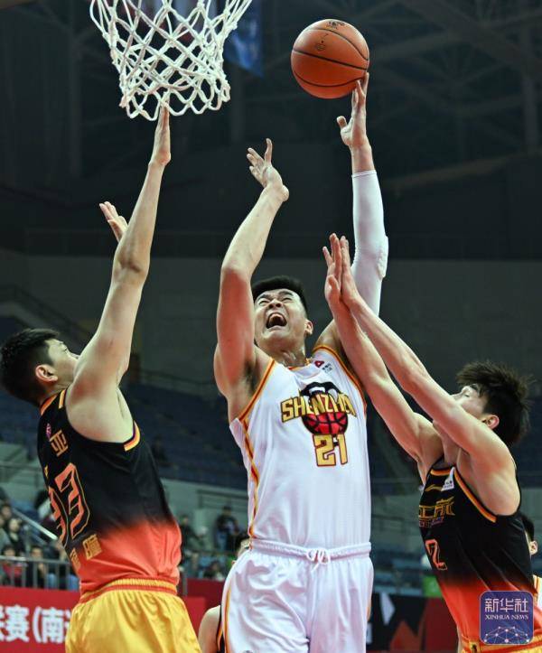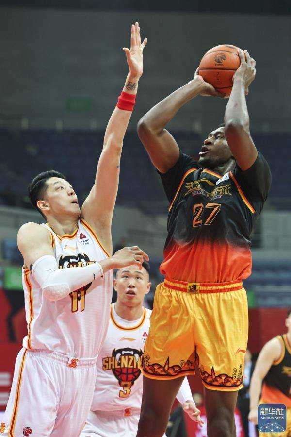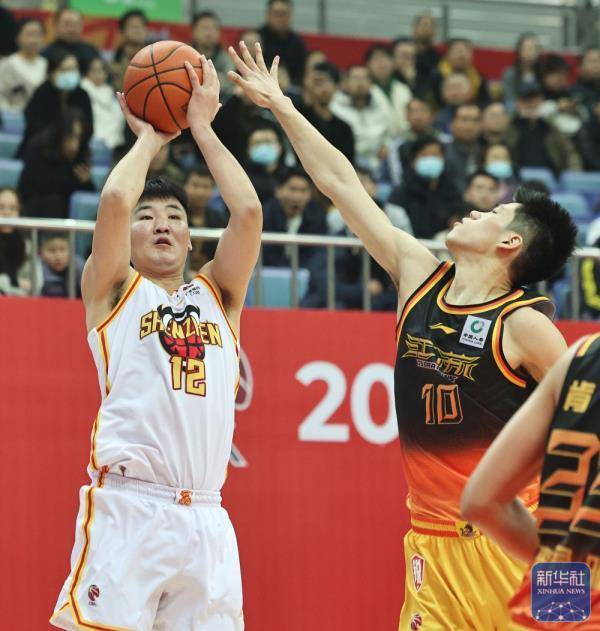 ↑3月28日,深圳马可波罗队球员顾全(左)在比赛中投篮。新华社发(徐培钦摄)