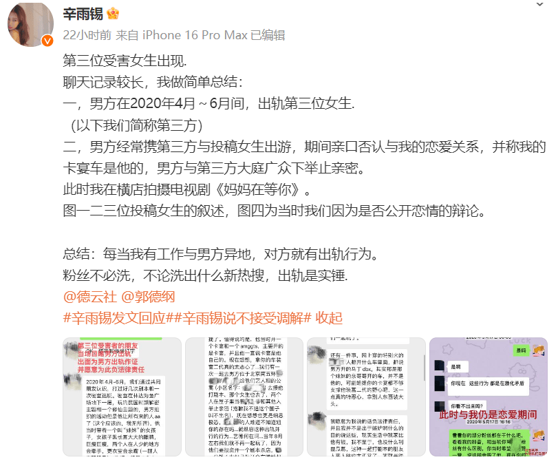 除了被曝孕期出轨之后,辛雨锡还告知秦霄贤和她在一起的时候,出轨对象不止一人,第三位受害女生也站出来了,说秦霄贤2020年4月到6月,出轨第三位女生,还亲口否认过他和辛雨锡关系,称辛雨锡的豪车是他自己的。