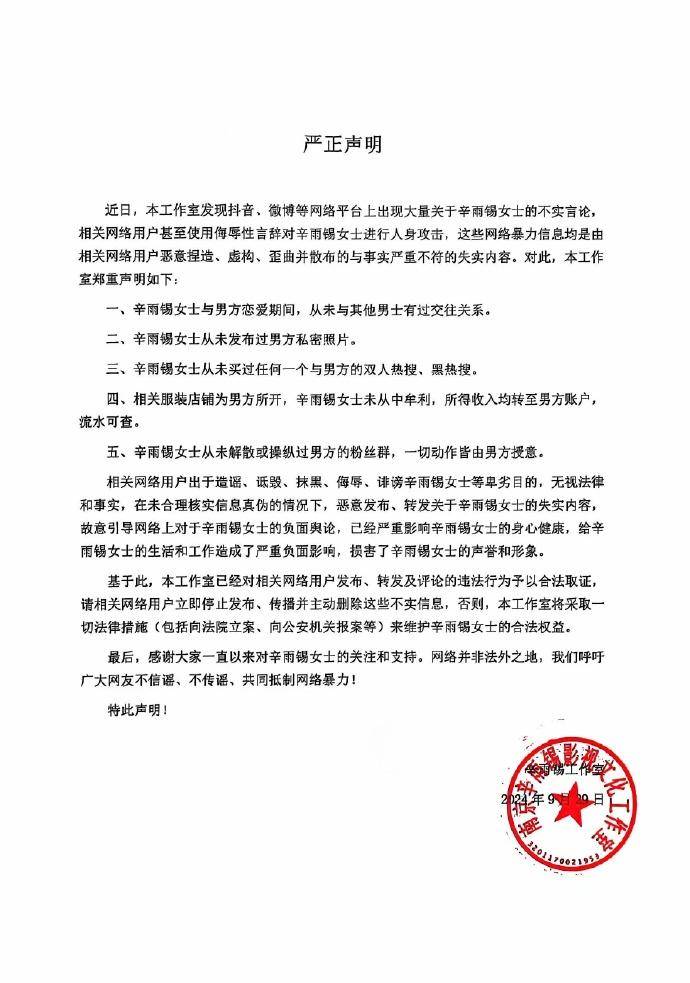 当下,辛雨锡工作室也发了声明,否认与秦霄贤恋爱期间与其他男生有过交往关系,也从未发过男生私密照,从未买过任何一个与男方的双人热搜,相关服装店铺为男方所开,辛雨锡未从中牟利。