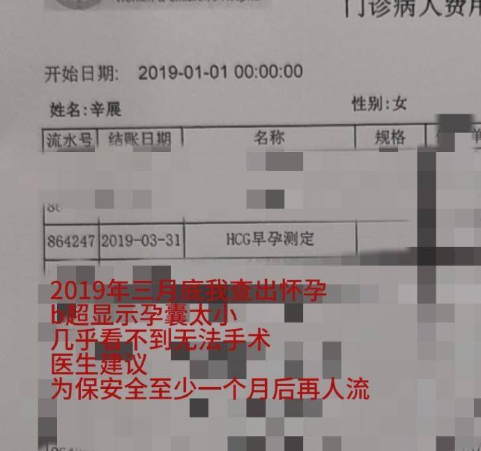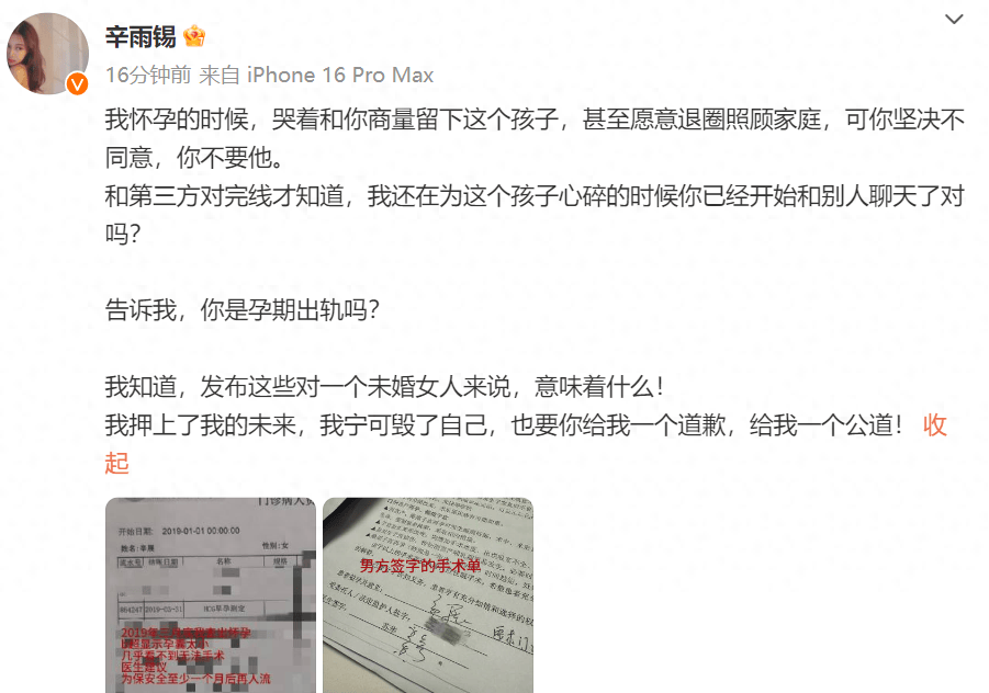 在晒出的检查报告上显示,辛雨锡于2019年3月31日,被检查出怀孕,她说当时B超显示孕囊太小,几乎看不到,医生建议为保安全至少一个月后再人流,辛雨锡还晒出秦霄贤签字的手术单,证实自己所言非虚。